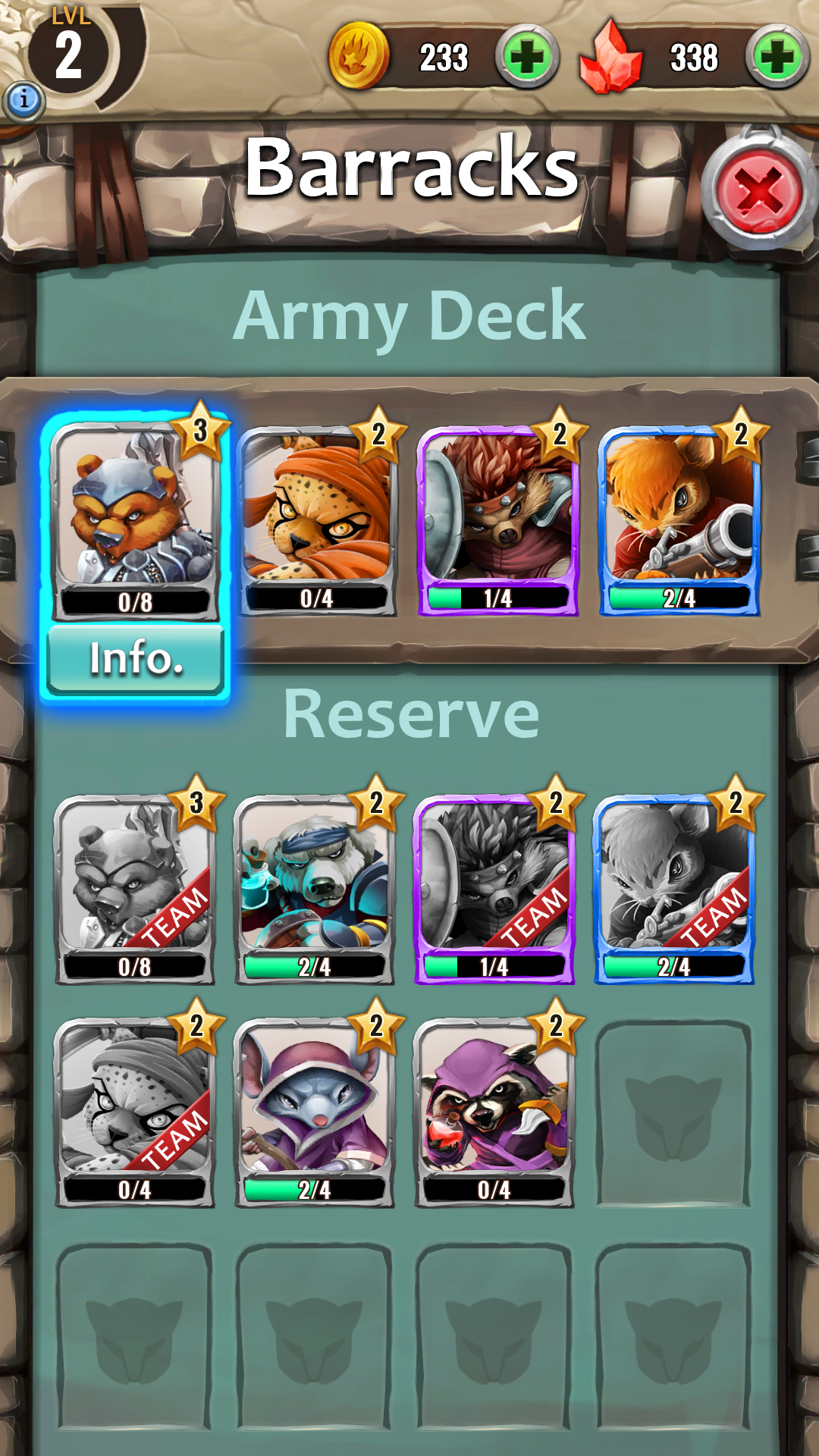 Para información acerca de Stats y habilidades de un Héroe vaya al cuartel (dentro del Pueblo) > haga ćlic en el Héroe > use el botón: «Info»